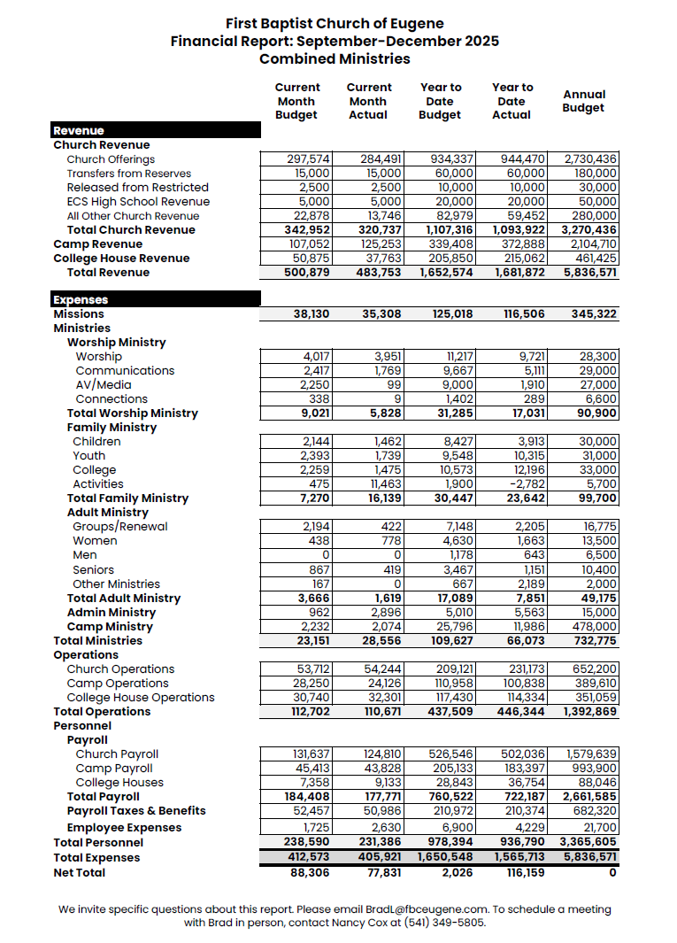 At First Baptist Church of Eugene, every gift matters—whether large or small, recurring or one-time. We believe generosity is an act of worship, and we are committed to stewarding your contributions with integrity, transparency, and alignment with our mission to glorify God and serve people.